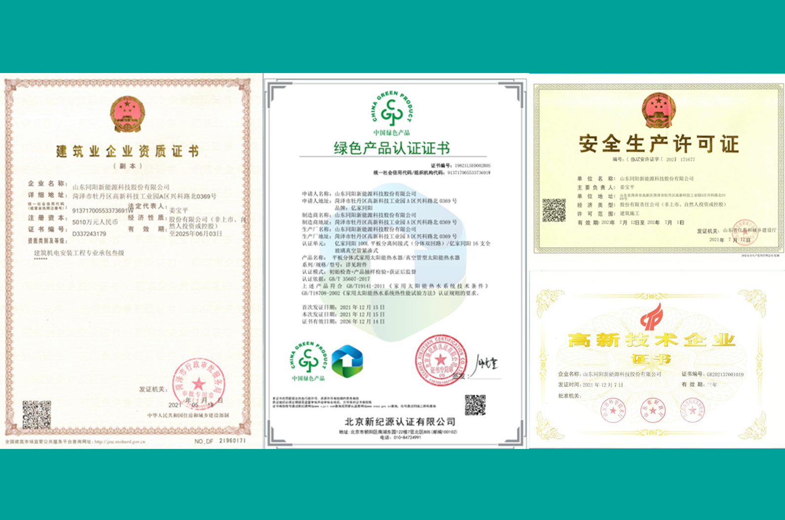2020-2021年公司連續(xù)榮獲“機(jī)電安裝三級(jí)資質(zhì)”“安全生產(chǎn)許可證資質(zhì)”,榮獲“中國(guó)綠色產(chǎn)品”認(rèn)證、“國(guó)家級(jí)高新技術(shù)企業(yè)”等資質(zhì),成為光熱行業(yè)資質(zhì)較全的企業(yè)之一