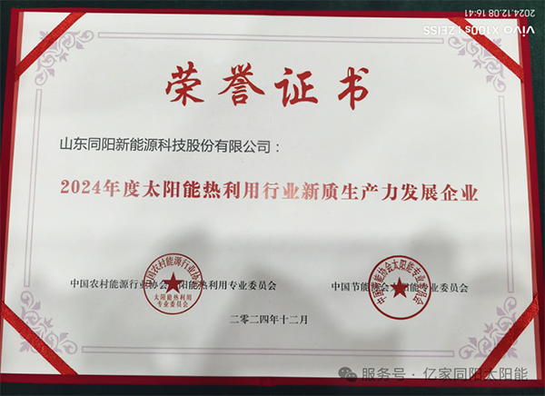 在本屆年會上,億家同陽榮獲由中國農(nóng)村能源行業(yè)協(xié)會太陽能熱利用專業(yè)委員會與中國節(jié)能協(xié)會太陽能專業(yè)委員會共同頒發(fā)的“2024年度太陽能熱利用行業(yè)誠信單位”、“2024年度太陽能熱利用行業(yè)新質(zhì)生產(chǎn)力發(fā)展企業(yè)”兩大榮譽稱號。