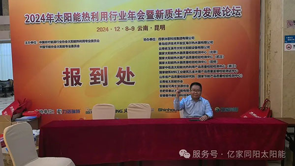12月8-9日,山東同陽新能源科技股份有限公司受邀參加了2024年太陽能熱利用行業(yè)年會,公司董事長陳永峰、總經(jīng)理姜仁良、財務(wù)總監(jiān)張瑞娟出席。在會上,姜總以“扎根行業(yè) 服務(wù)行業(yè)”做主題演講,強(qiáng)調(diào)了億家同陽將以全心全意為客戶和行業(yè)服務(wù)的理念發(fā)展下去。與此同時,億家同陽借行業(yè)年會之機(jī),傳承這份陽光之志,與行業(yè)同仁再敘陽光之情!