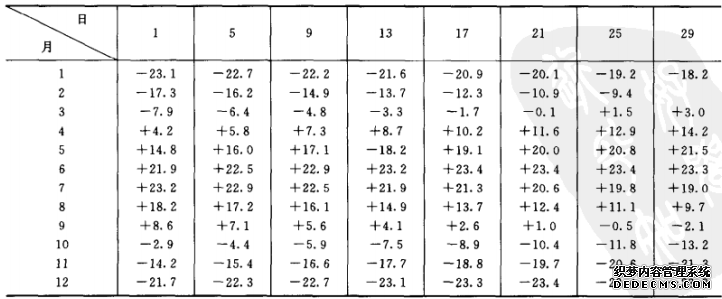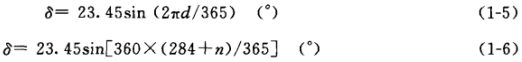 式中石δ--一年中第n天或離春分第d天的赤緯,春分和秋分日δ= 0,冬至日δ=-23. 50,夏至日 5=23. 50; d—由春分日算起的第d天; n—一年中的日期序號。