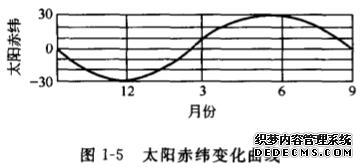 圖1-5為太陽赤緯變化曲線,表1-3為太陽赤緯與日期對照表,可從曲線圖或表格中 直接?xùn)苏页嗑曋怠?br />
